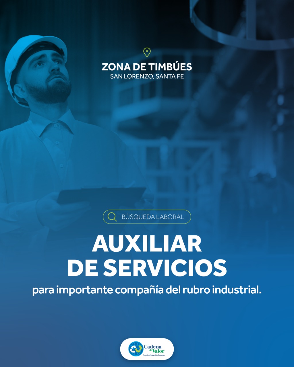 Cadena de Valor Consultora Integral de Empresas se encuentra en proceso de selección de un/a Auxiliar de Servicios para una importante compañía del rubro industrial, con sede en la zona de Timbúes, cercana a la ciudad de San Lorenzo (Santa Fe).